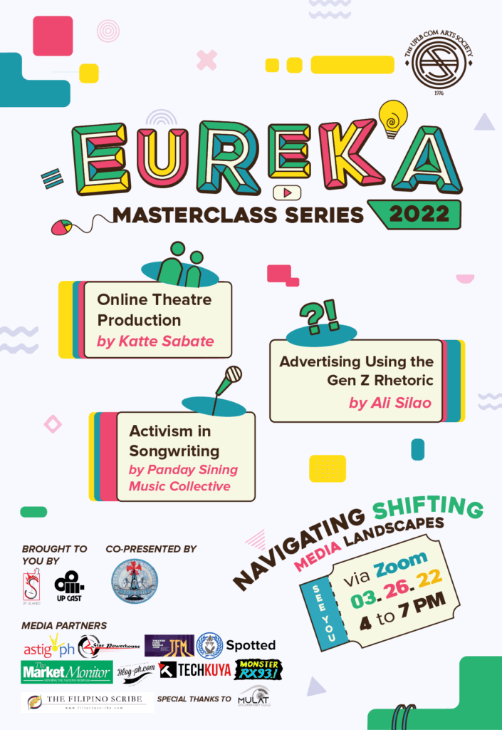 For this year’s installment, the UPLB Com Arts Society will uncover the fast-changing environment of media and communications in Eureka Masterclass Series 2022 this coming March 26, 2022. These workshop series are filled with discussions and exercises that are tailored to further cultivate individuals towards excellence, covering the topics of Songwriting, Advertising, and Theatre Production.